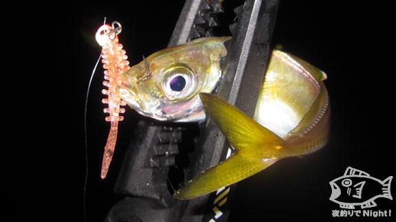 こんなサイズのアジ君がポツポツ遊んでくれてバイトがなくなったのでルアーチェンジする♪